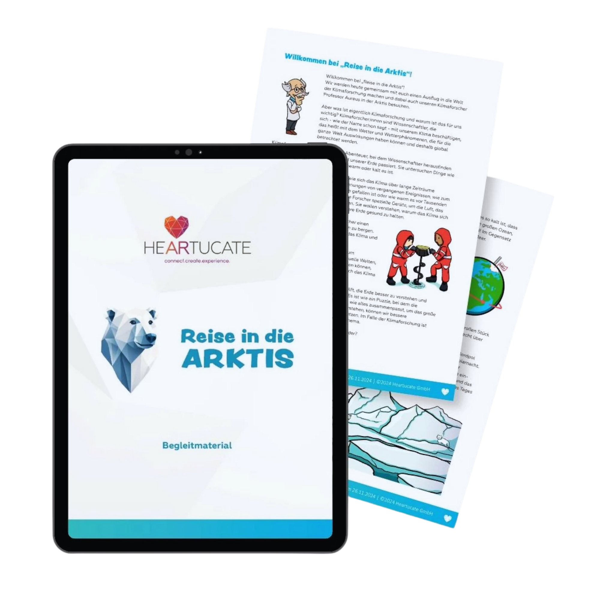 Für die App „Reise in die Arktis“ steht sorgfältig ausgearbeitetes Begleitmaterial bereit. Eine Präsentation führt anschaulich in Klimawandel und Arktis ein, während ergänzende Arbeitsblätter die Themen Ökosystem Arktis, Klimaforschung, Klimamodelle und konkrete Handlungsmöglichkeiten vertiefen. Abgerundet wird das Paket durch eine detaillierte Schritt-für-Schritt-Anleitung, die Lehrkräften die Planung und Durchführung eines kompletten Projekttages erleichtert.